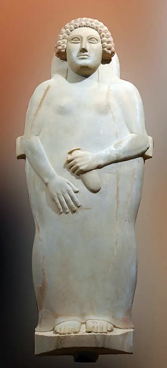 The Lady of Cádiz is a serene masterpiece sculpted in Sidon, Lebanon, around 480 BC. She is depicted with a straight (Greek) nose, open almond-shaped eyes, full lips and a very prominent chin. Her hair is styled in long, wavy locks covering, showing reddish paint remnants. Clad in a long tunic that reaches her bare feet, her arms are bent at the elbows, her left hand cradling an alabastron. Sarcophagi of this high calibre you will only find in Palermo or Beirut.