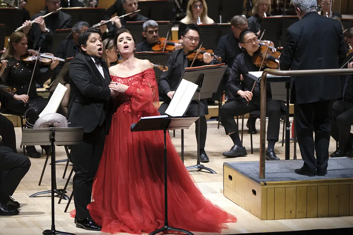 Eronela Jaho (Magda) and Iván Ayón Rivas (Ruggero) in Opera Rara’s La Rondine at the Barbican Photo: Russell Duncan, BBC SO