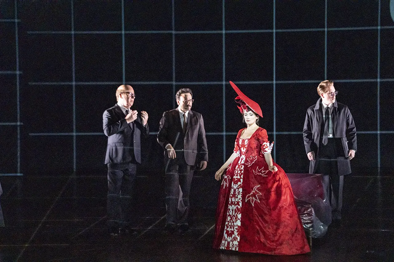 Enter Cherubino, the Count’s page and the Countess’s godchild. This is humorous gender juggling at its best and one of the best, if not the best trouser role ever written. Lea Desandre’s Cherubino is a badly dressed (red tracksuit), cheeky, guileless and yet vulnerable adolescent. He is easily sexually aroused, and admits to Susanna that he can’t help flirting with every girl he meets, including her. His aria Non so piu cosa son, cosa faccio requires both breathless articulation and seamless legato control – not forgetting the masculine physicality of the role. Desandre meets these challenges with ease, aided by a natural, almost shimmering, vibrato. You immediately feel how much she relishes this showpiece of a role for a young opera singer.